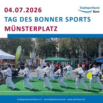 Der Tag des Bonner Sports findet in diesem Jahr am Samstag, den 04.07.2026 auf dem Bonner Münsterplatz statt. Von 11.00 bis 16.00 Uhr habt Ihr wieder die Möglichkeit Euch mit Euren Vereinen auf dem Münsterplatz vorzustellen; ob in Form eines Infostandes, eines Mitmachangebotes oder einer Vorführung auf der Aktionsfläche.